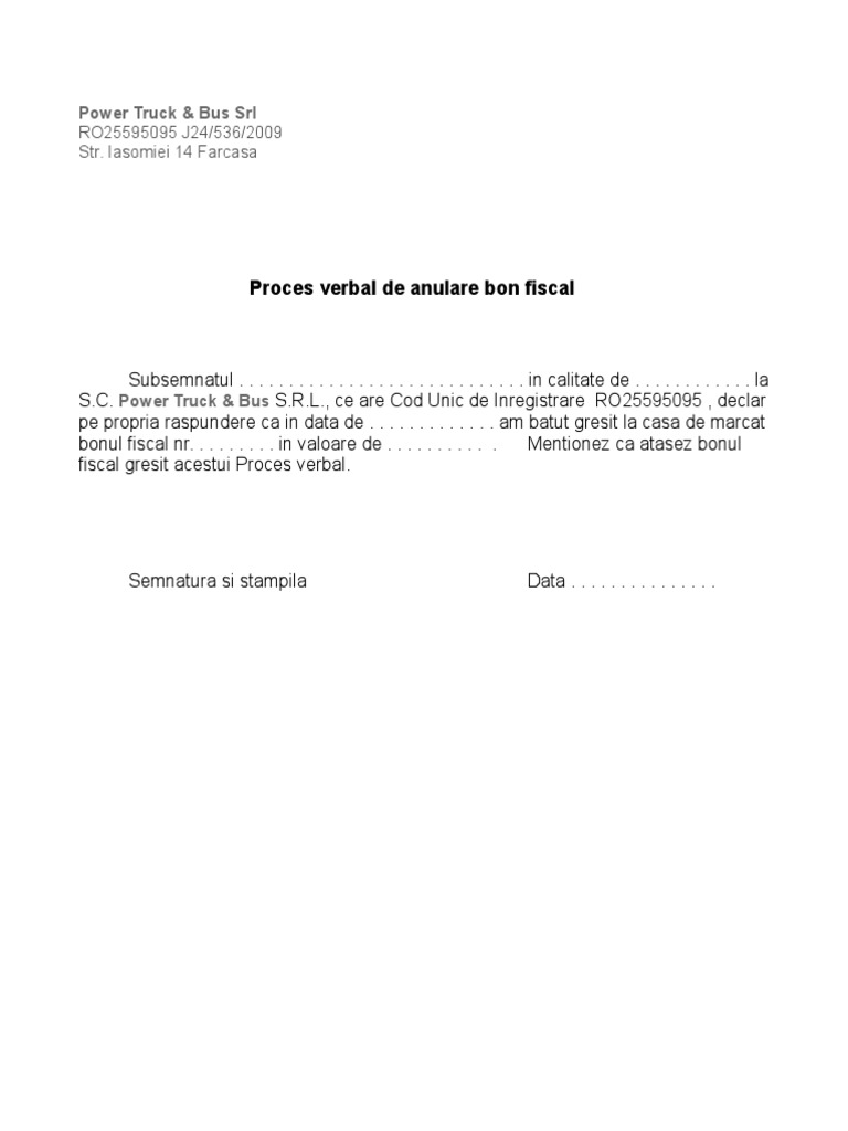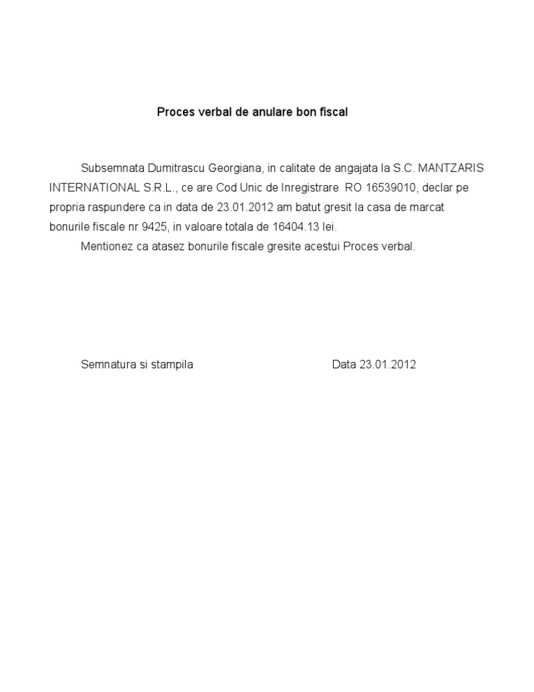 Proces Verbal De Anulare Bon Fiscal Pentru Inregistrarea In