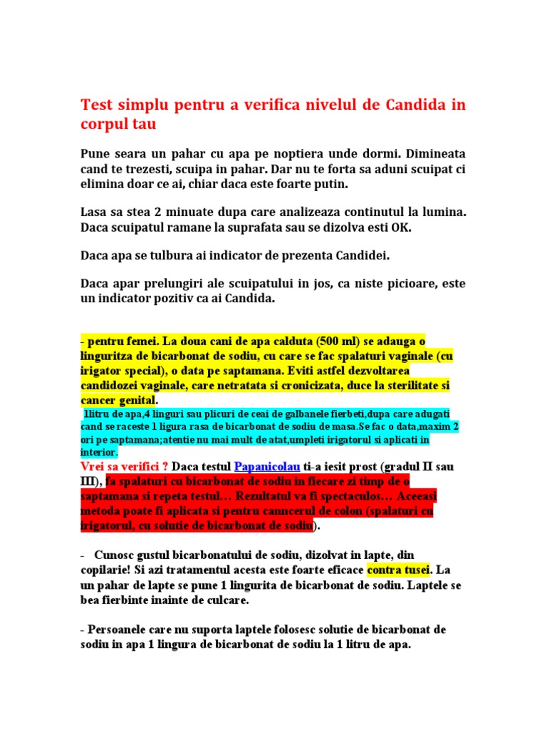 Tratament naturist candida cu bicarbonat. Adaugati 1 2 lingurita de bicarbonat de sodiu in 1 pahar de apa preferat apa calda. Daca in apa se adauga bicarbonat de sodiu sau suc de lamaie legumele si fructele se spala mult mai bine. Vaginita se datoreaza in principl infectiilor fungice provocate de candida albicans.