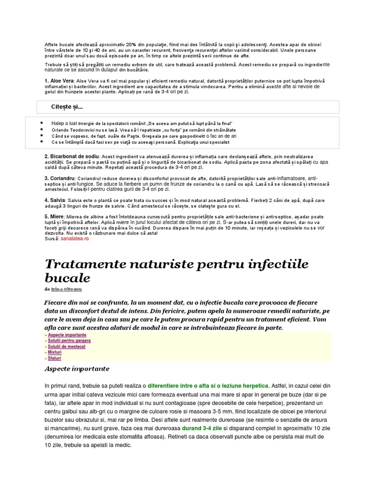Pentru afte se recomandă gargara cu o soluţie dintr un pahar cu apă şi o linguriţă de bicarbonat. Pentru asta poti sa iti clatesti pur si simplu gura cu apa si bicarbonat sau poti sa il aplici direct pe afta. Se pare că există şi alte soluţii mai la îndemână decât ne am fi aşteptat. Vindeca aftele bucale bicarbonatul de sodiu este foarte eficace in tratarea aftelor bucale.